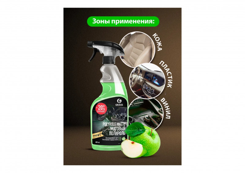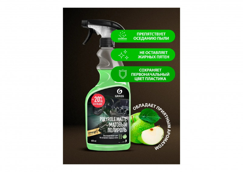 Полироль-очиститель пластика матовый Grass Polyrole Matte яблоко, 600 мл 110426 - профессиональный матовый полироль, предназначенный для обработки приборных панелей, неокрашенных бамперов, покрышек, для очистки полировки изделий из кожи, дерева, винила, пластика и резины. Очиститель пластика сохраняет первоначальный цвет, не оставляет жирных пятен, препятствует оседанию пыли, придает поверхности матовый эффект.