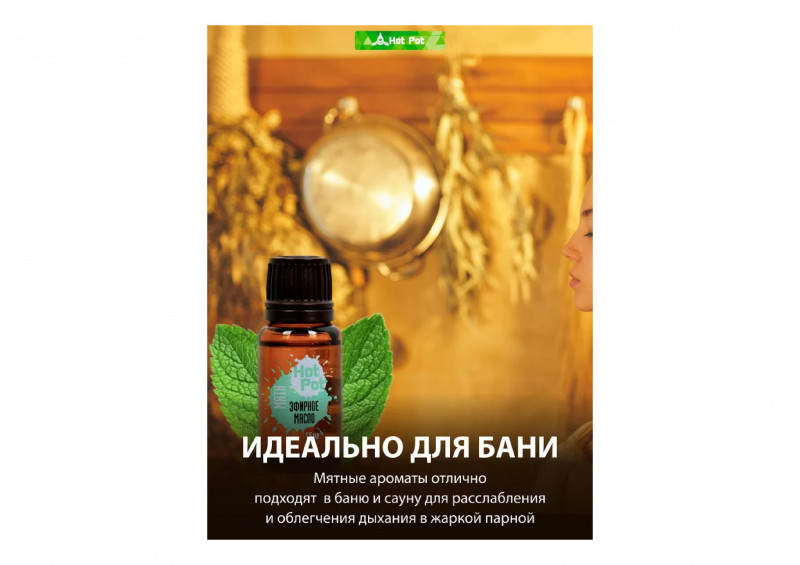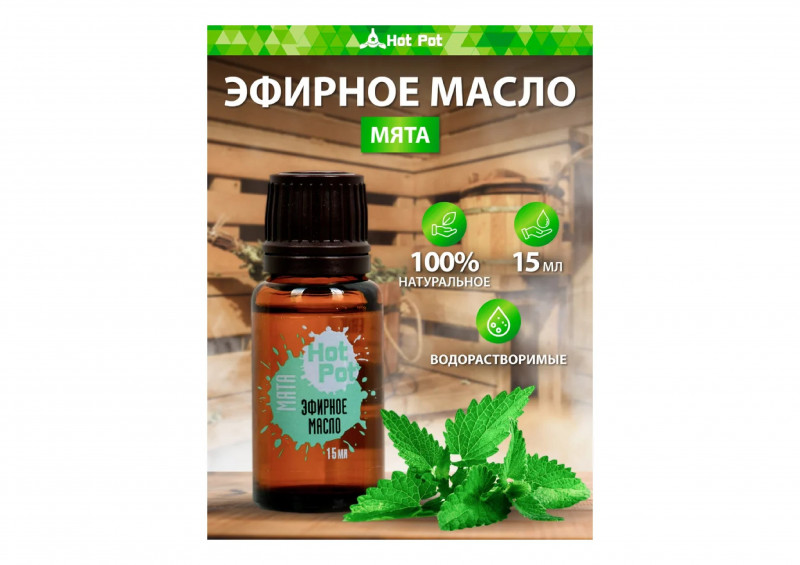 Эфирное масло Hot Pot Мята, 15 мл 32264 сделает банные процедуры еще полезнее.