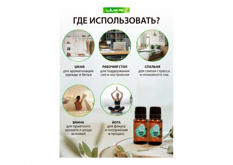 Аромат усиливает расслабляющее действие бани и сауны. Проникая с паром в кожу и кровь, масло избавляет от мышечного напряжения, ускоряет выведение токсинов и лишней жидкости.