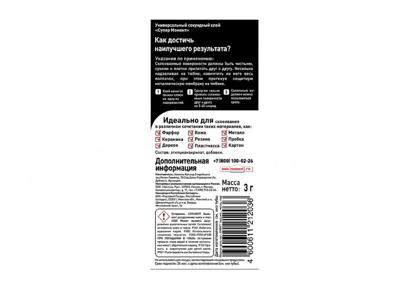 Супер клей Момент 608976 используют для быстрого склеивания таких материалов, как фарфор, керамика, дерево, кожа, резина, металл, пробка, картон и большинство пластиков. В составе данного клея — смола эпоксидная. Склеивание осуществляется всего за 5 секунд. Благодаря прозрачному составу место склеивания совсем незаметно. сверхпрочный клеевой шов выдерживает нагрузку до 200 кг на см2. Хранить необходимо в сухом месте при температуре от -20 ºС до +30 ºС. Поставляется на блистер-карте. Срок годности — 24 месяца.