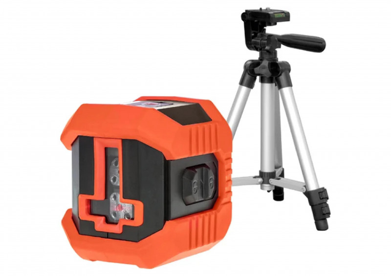 Лазерный нивелир проецирует горизонтальную и вертикальную линии. Он широко используется при укладке кафеля, установке карнизов, монтаже мебели и т.д. Возможно раздельное включение плоскостей, а также предусмотрен режим построения наклонных лазерных линий. В комплект входит легкий алюминиевый штатив, у которого выдвигается центральная секция. Высота регулируется в диапазоне 14 см